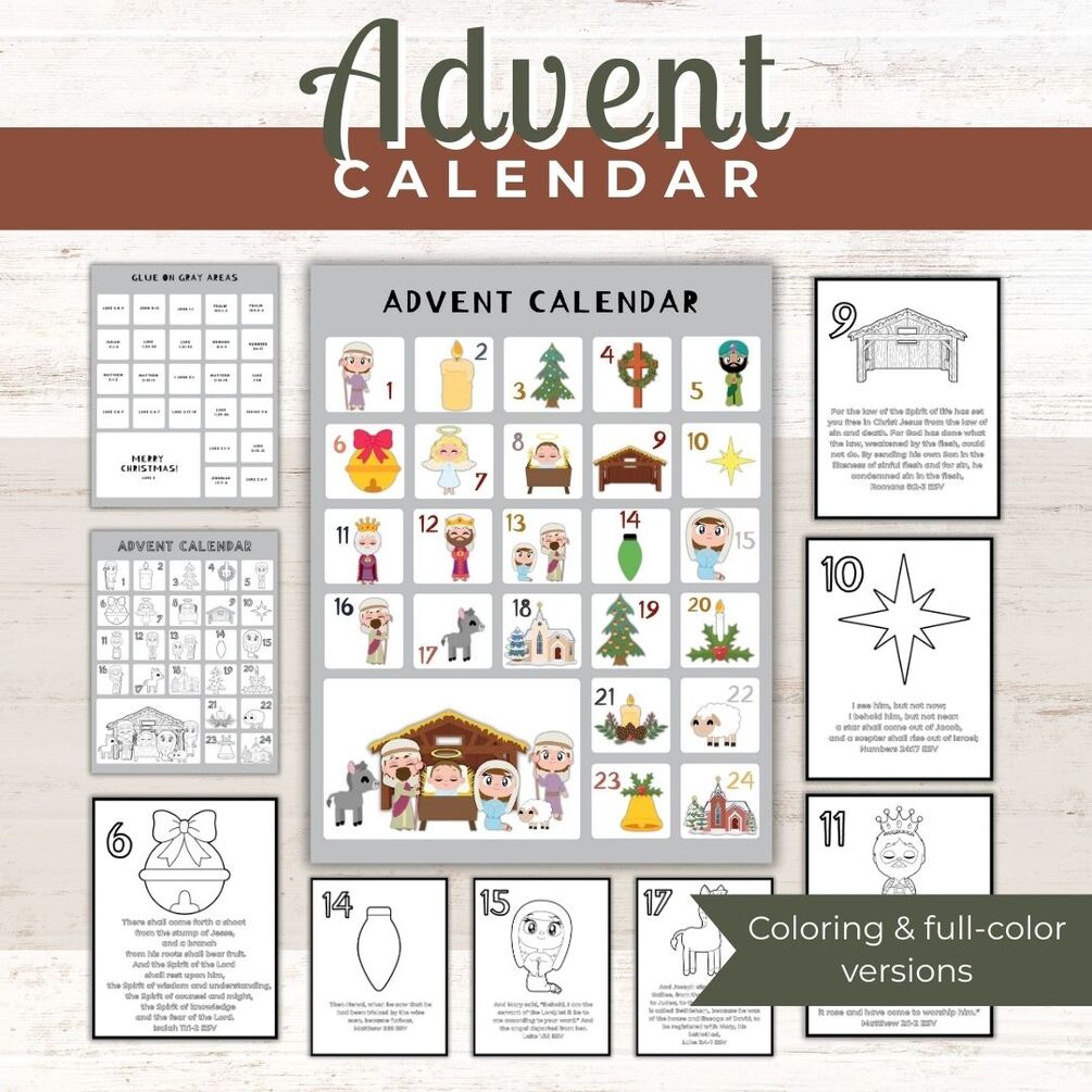 This printable Advent calendar has a coloring and a full-color option, plus coloring pages with the corresponding scriptures for every day of Advent (1st -24th).