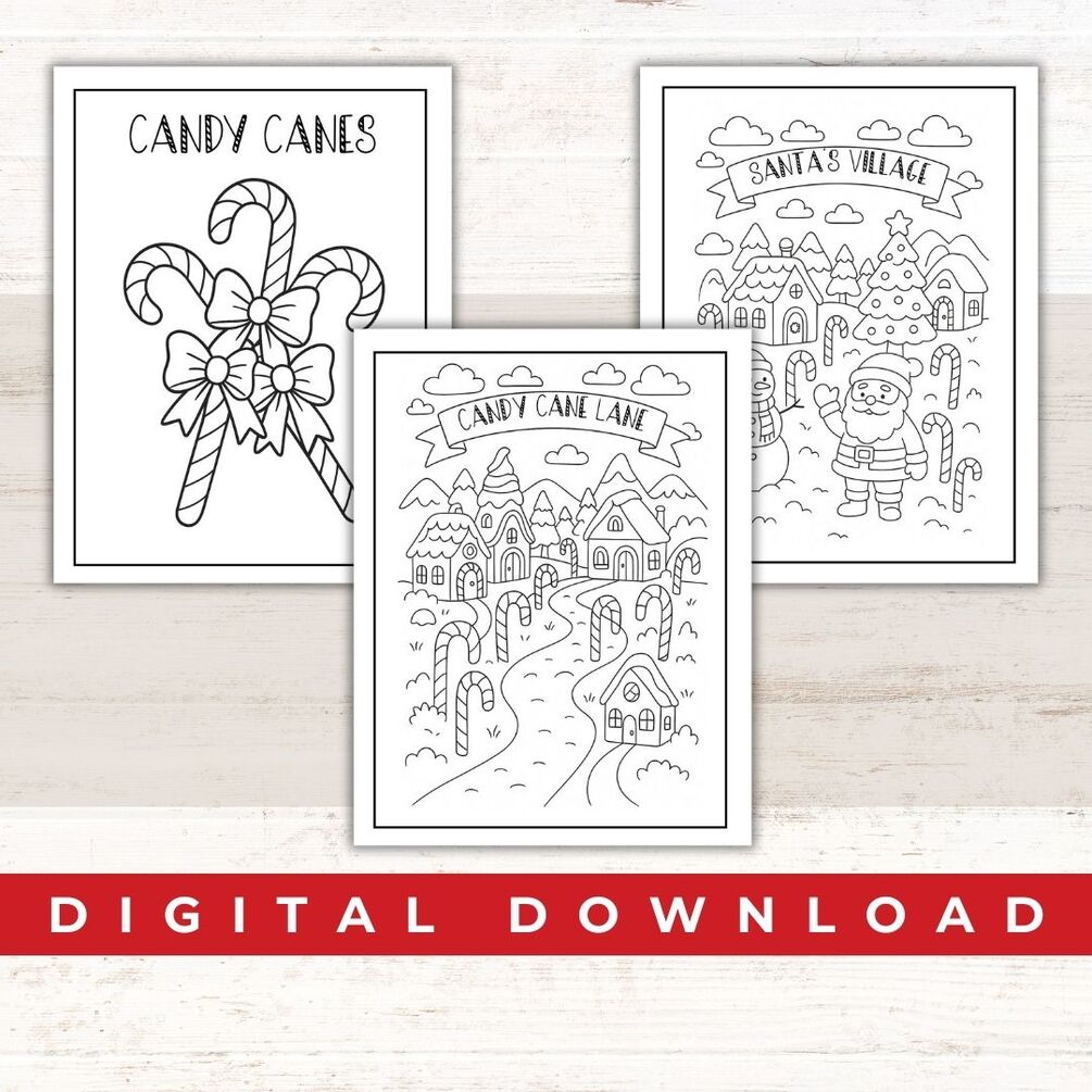 Each page is created with bold, kid-friendly line art—easy for little hands to color, and charming enough for adults to enjoy too. The designs feature a variety of candy canes, bows, arrangements, and festive scenes, giving you a whole bundle of Christmas cheer in one download!