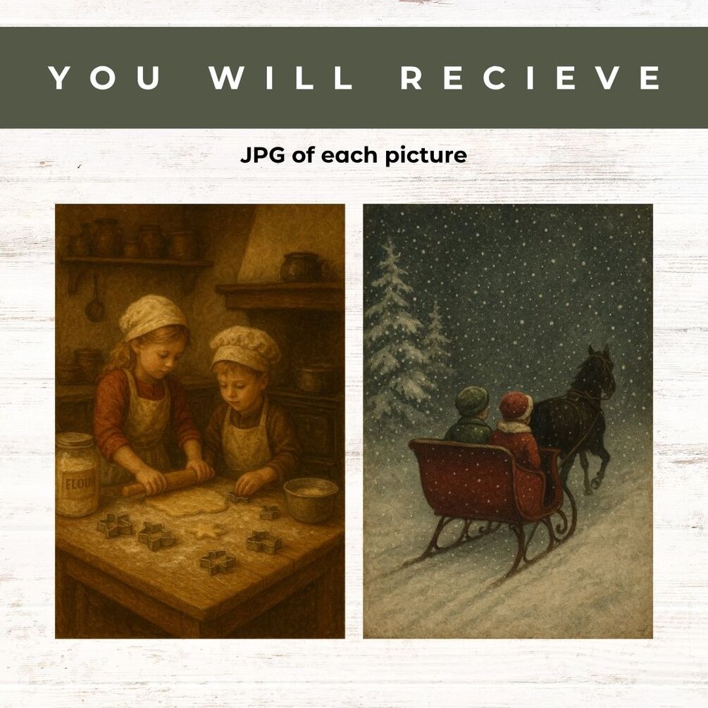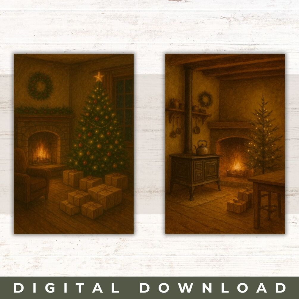 Each piece in this collection features timeless Christmas scenes like softly glowing fireplaces, twinkling trees, snowy cottages, and nostalgic moments that capture the heart of the season. The artwork has a true vintage feel with painterly detail and gentle tones that pair beautifully with gold frames, greenery, and cozy holiday décor.