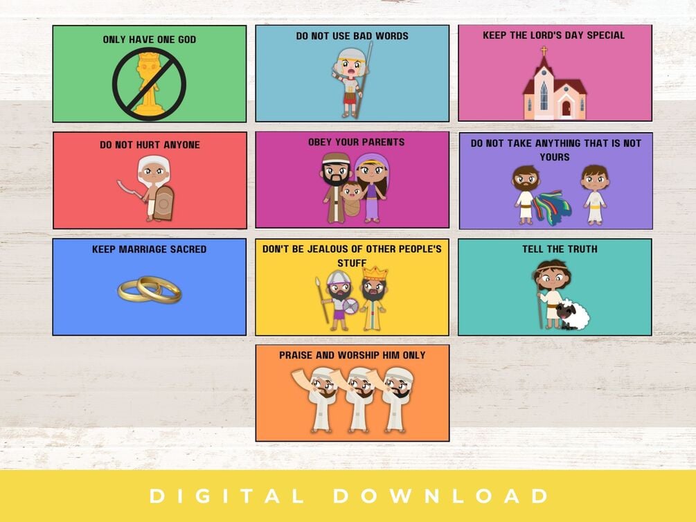 There are three pages in this printable. A full-color 10 commandment card page. A coloring 10 commandment card page. Plus the numbered page for creating a memory game.
