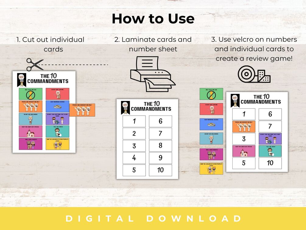 There are three pages in this printable. A full-color 10 commandment card page. A coloring 10 commandment card page. Plus the numbered page for creating a memory game.