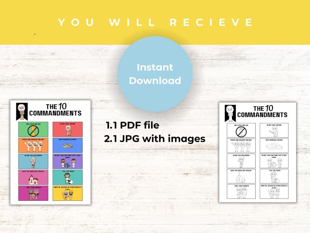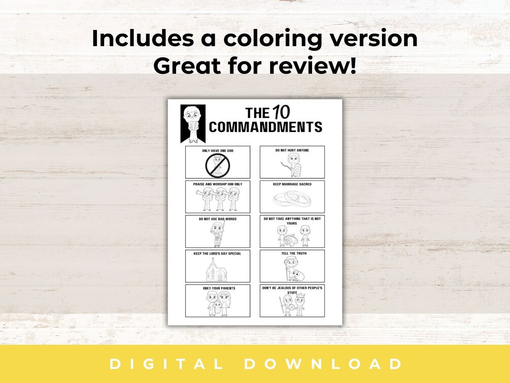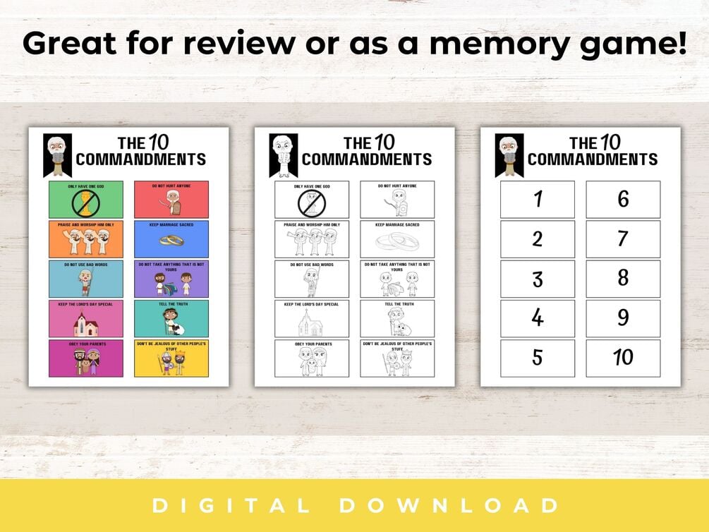 There are three pages in this printable. A full-color 10 commandment card page. A coloring 10 commandment card page. Plus the numbered page for creating a memory game.