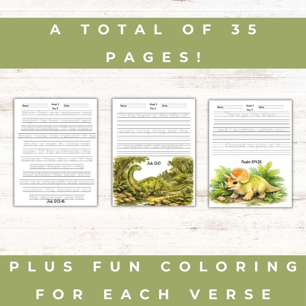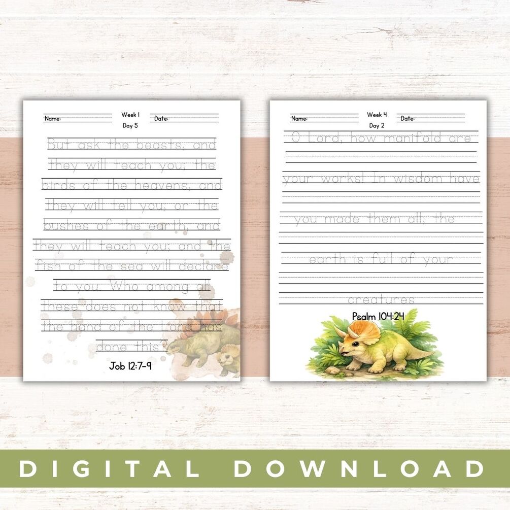 This faith-filled handwriting resource combines a love for dinosaurs with the truth of God’s Word, inviting children to slow down, trace, copy, and reflect on Scripture as they write. Inspired by verses that point to God’s wisdom, power, and creation, this set makes handwriting practice meaningful, engaging, and fun.