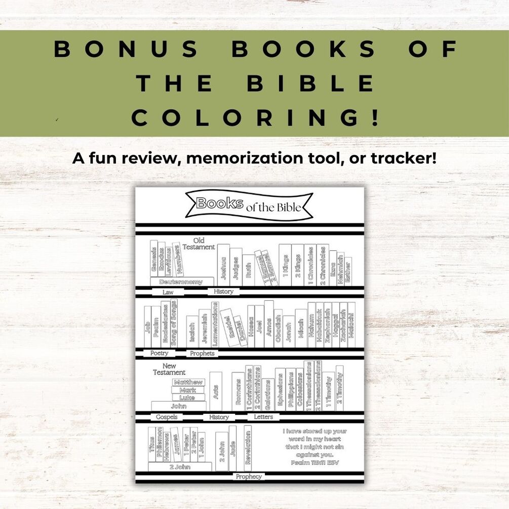 This set is designed to be used over 5 weeks, with a section of Bible verses to practice each week and a coloring page on the 7th day for review, rest, and creativity.