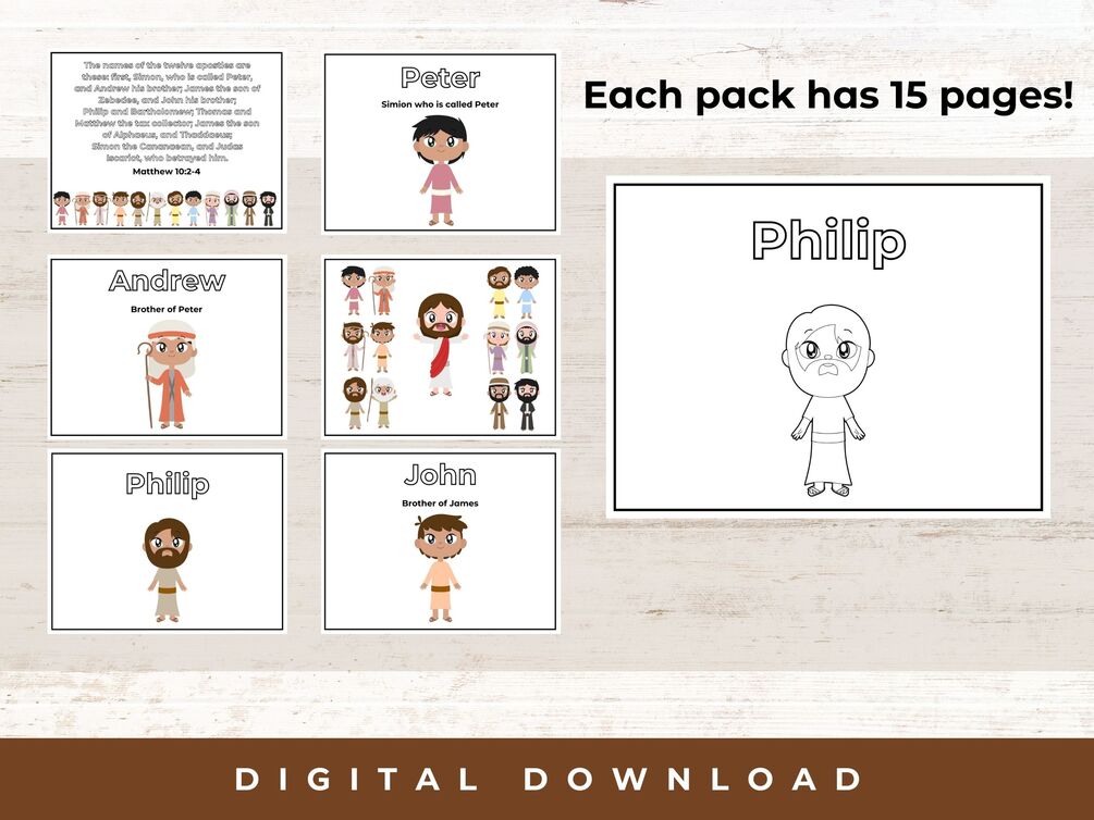 There are 15 pages total in the 12 disciples coloring pages with scripture verses about the 12 disciples plus pages with each disciple and their name. Great for lots of different lessons! You can find the digital download through the button about mid-way down on this page.