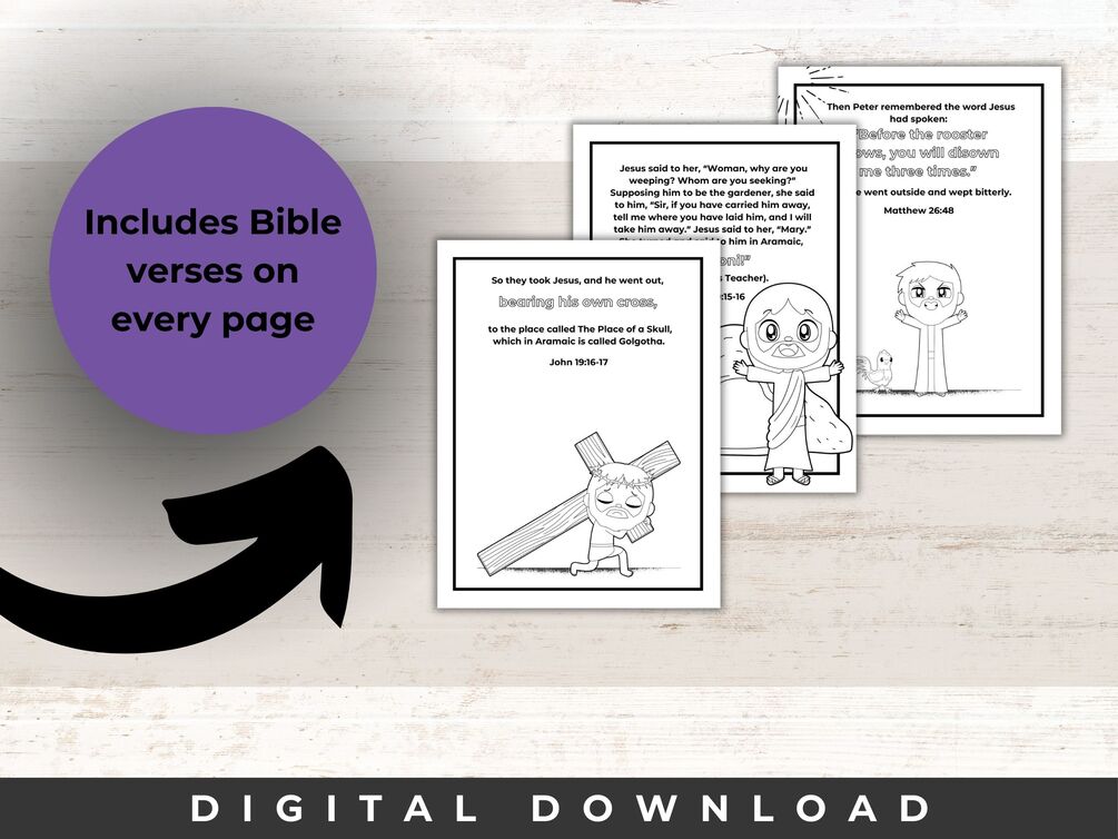 The pack follows the story of Jesus through Palm Sunday, Good Friday, the resurrection of Jesus Christ, and more from Resurrection Sunday. Scripture verses are taken from the ESV version of the Bible.