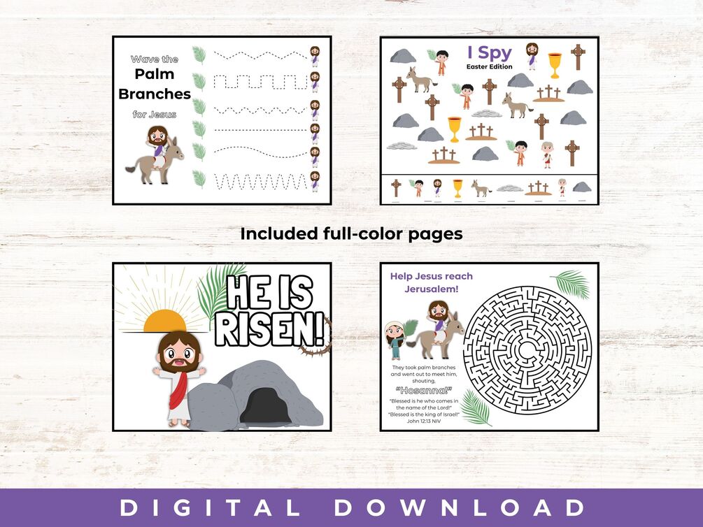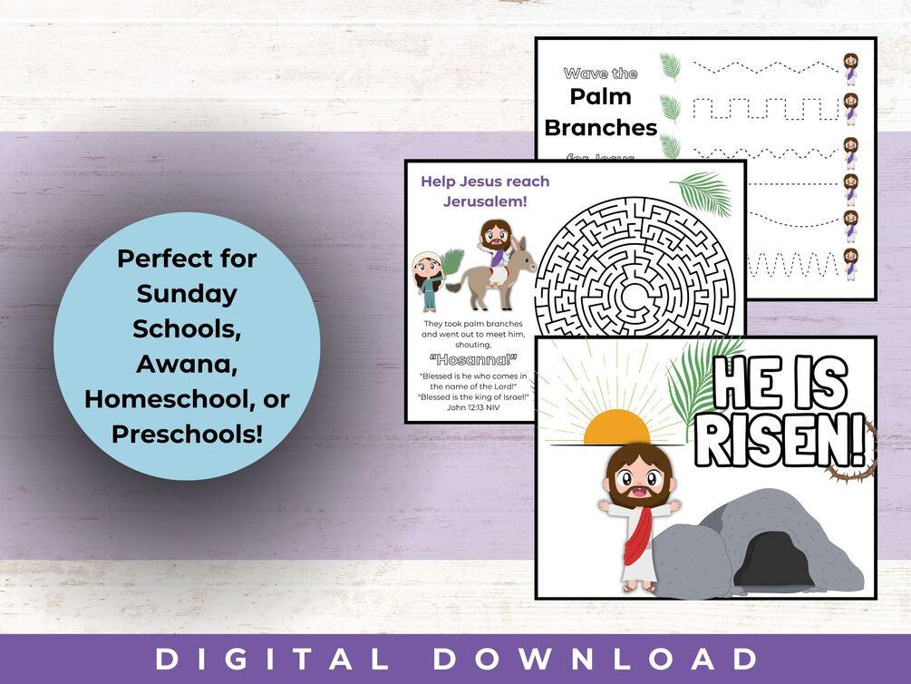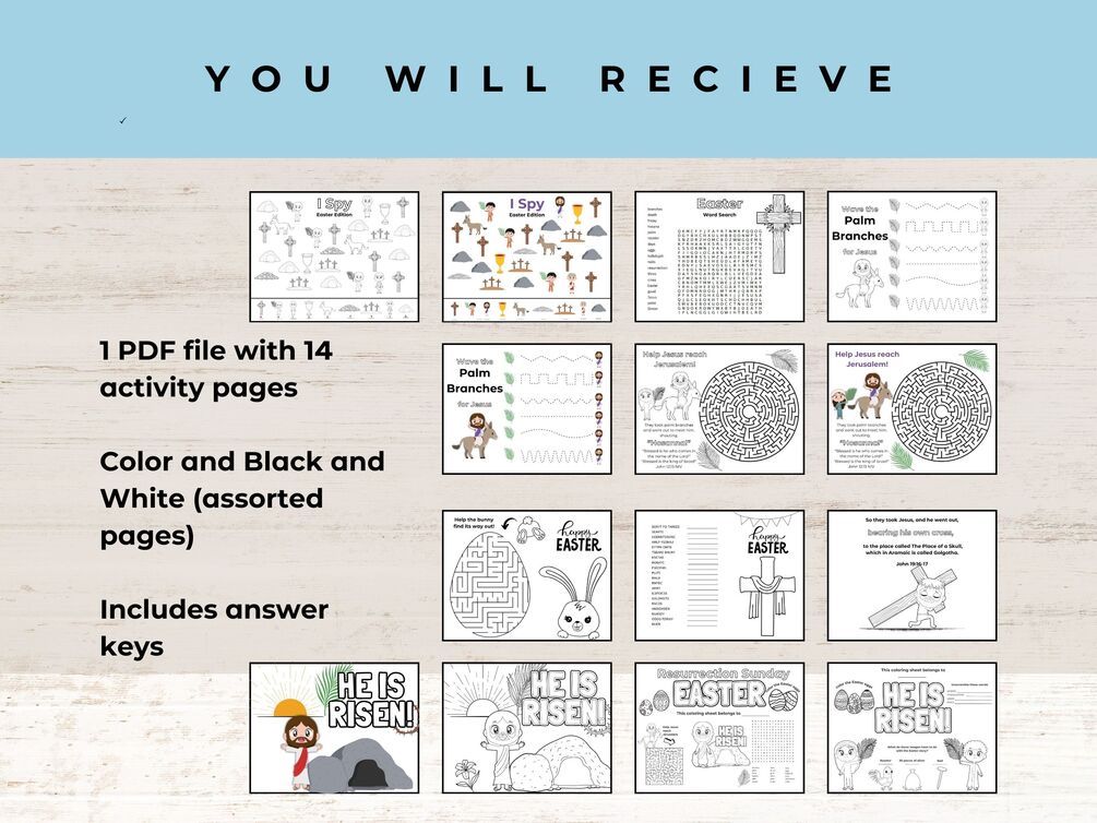There are 14 activity pages in the pack. It is a great way to teach kids about the death on the cross and the Resurrection of Jesus. Great variety of activities for grades K-5 with a Sunday School class or a homeschool family. Comes with the following items: