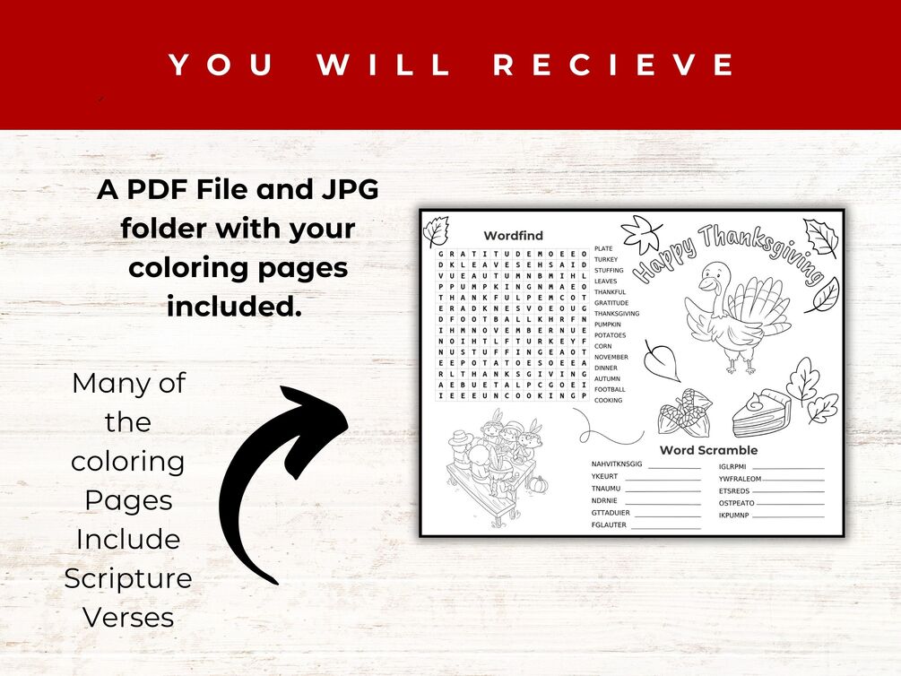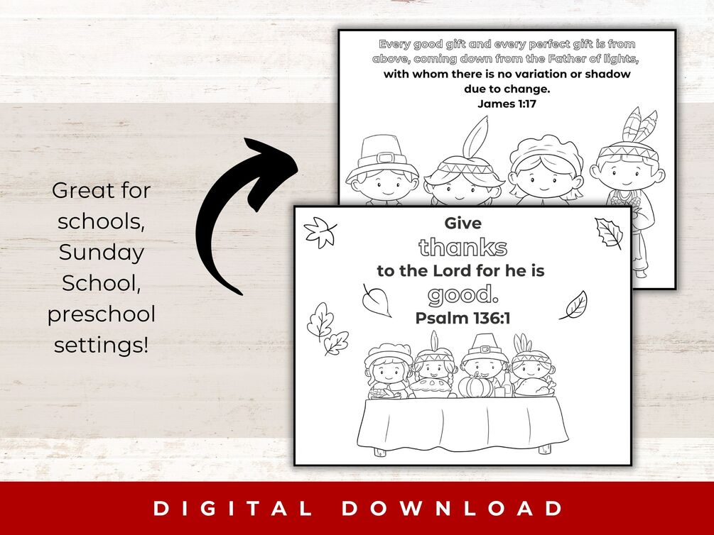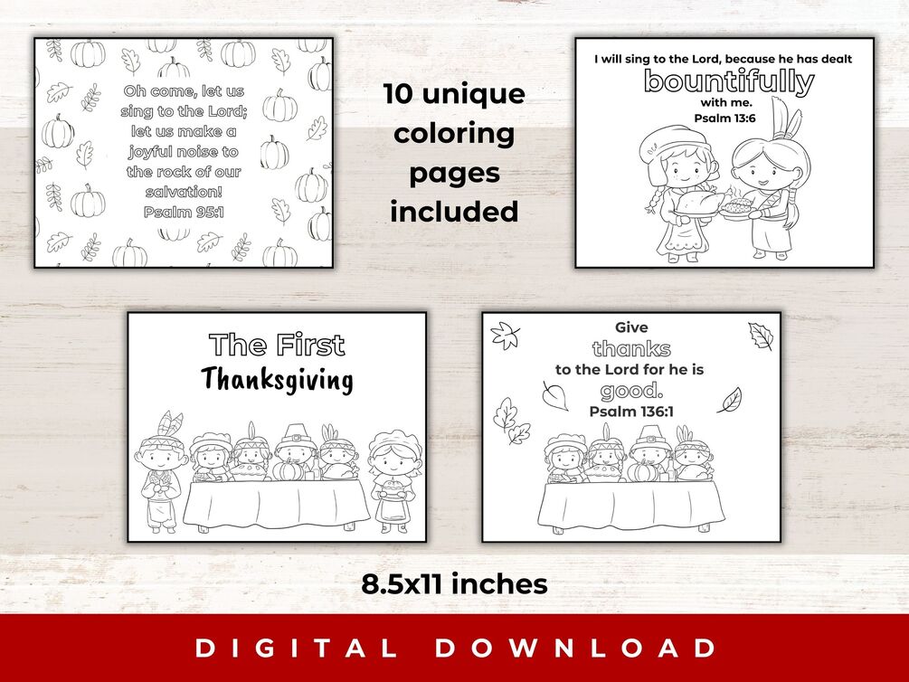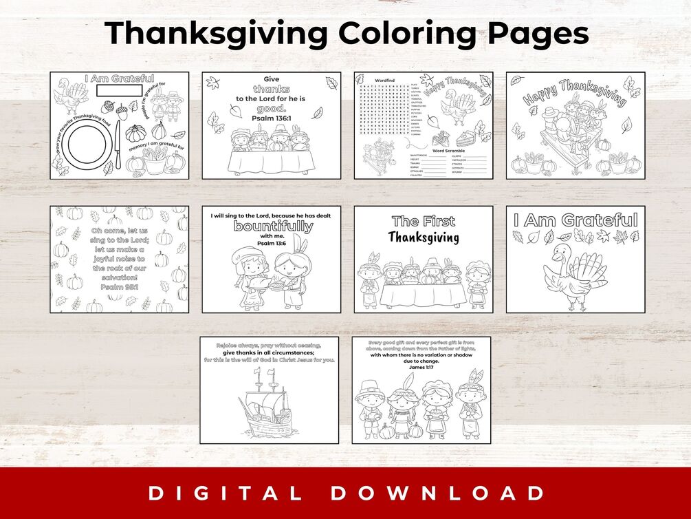 These coloring pages are a great way to teach scripture plus have a fun coloring page for Thanksgiving-themed images like pumpkins, pilgrims, native Americans, the Mayflower, and more!