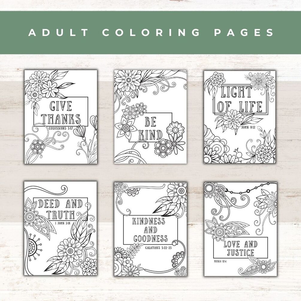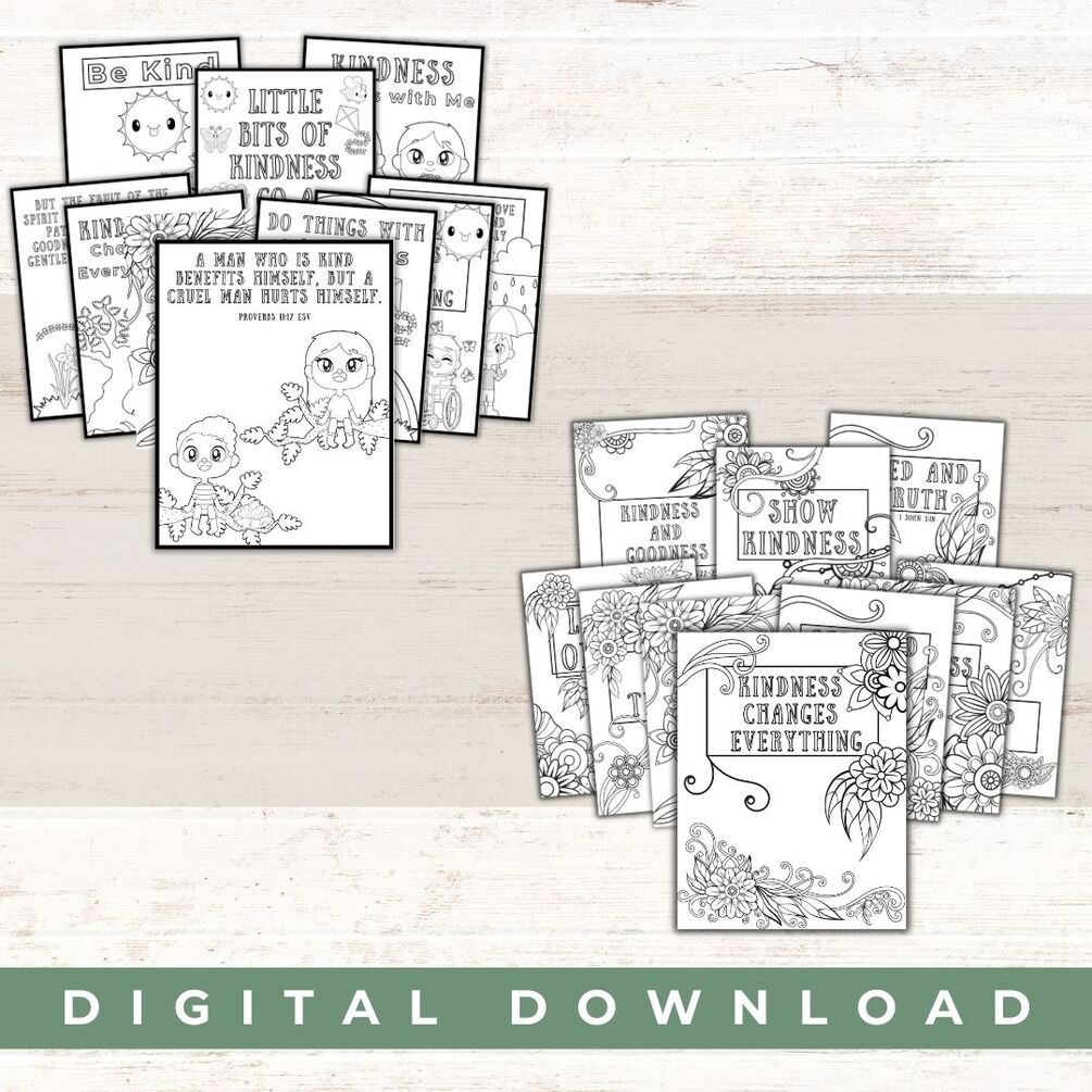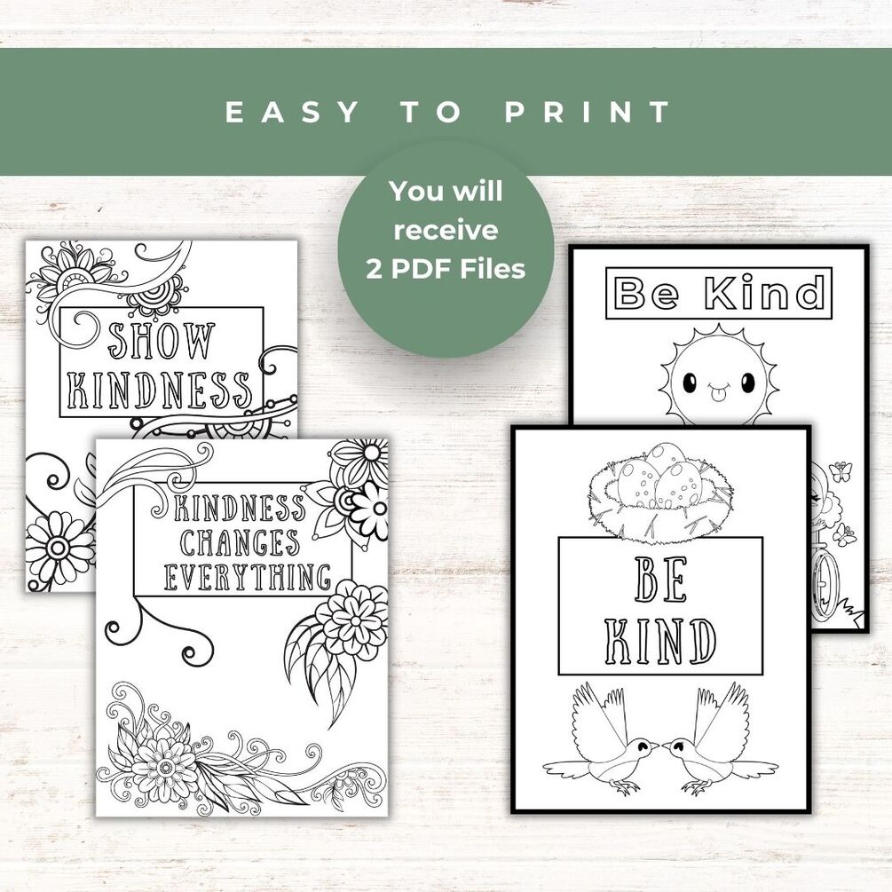 There are two packs of kindness coloring pages each with 10 pages. You will receive an adult set which has more intricate designs, and a kid's coloring set.