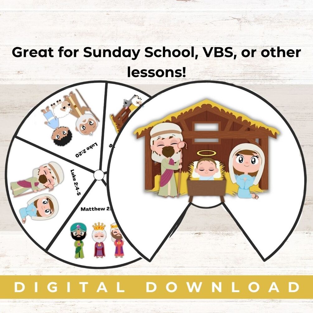Perfect for Sunday school, homeschool, classroom celebrations, or cozy December crafting at home, this spinner features Scripture references and sweet nativity artwork that children can color and assemble. Simply print on cardstock, cut, punch the center holes, and secure with a paper fastener—easy, meaningful, and memorable.