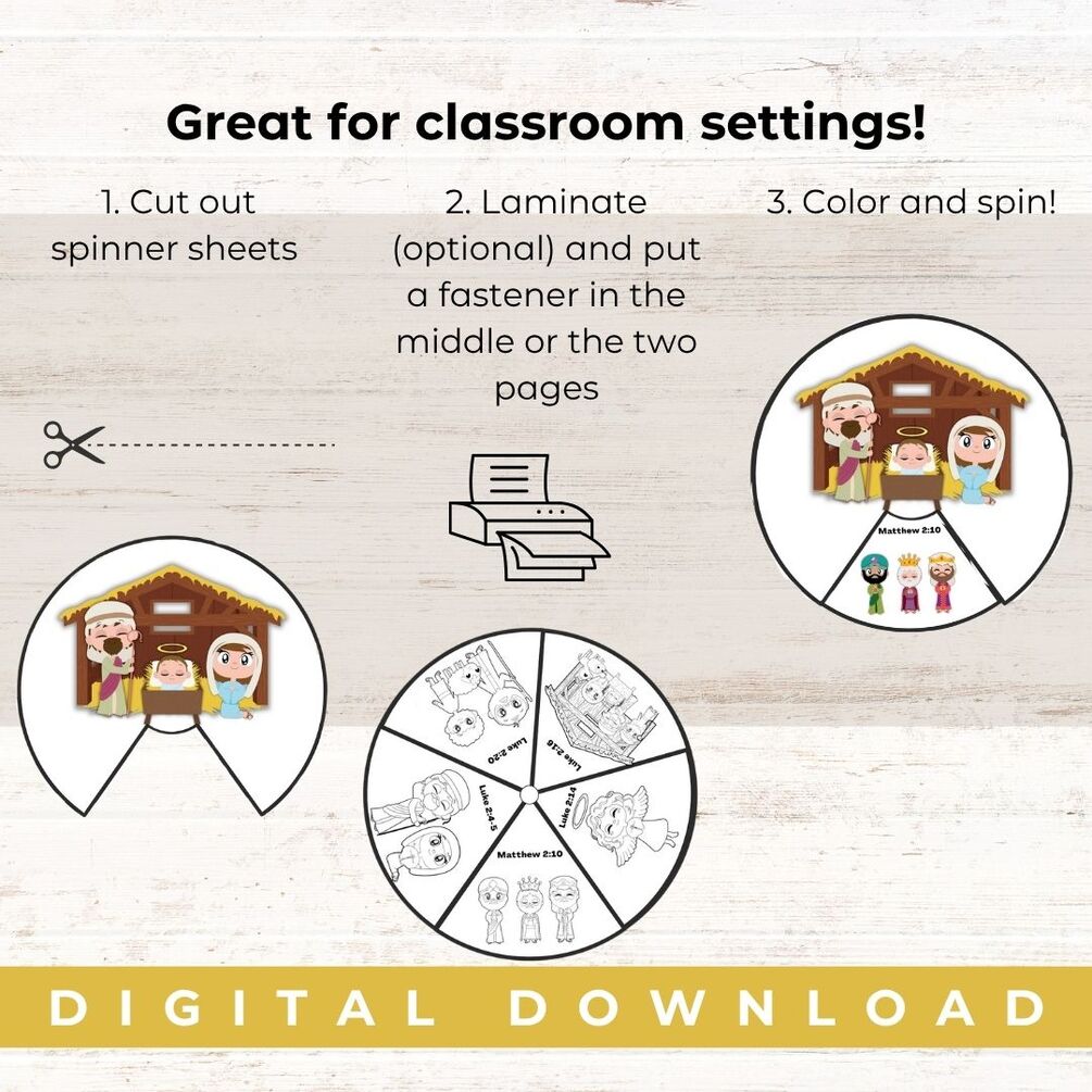 Perfect for Sunday school, homeschool, classroom celebrations, or cozy December crafting at home, this spinner features Scripture references and sweet nativity artwork that children can color and assemble. Simply print on cardstock, cut, punch the center holes, and secure with a paper fastener—easy, meaningful, and memorable.