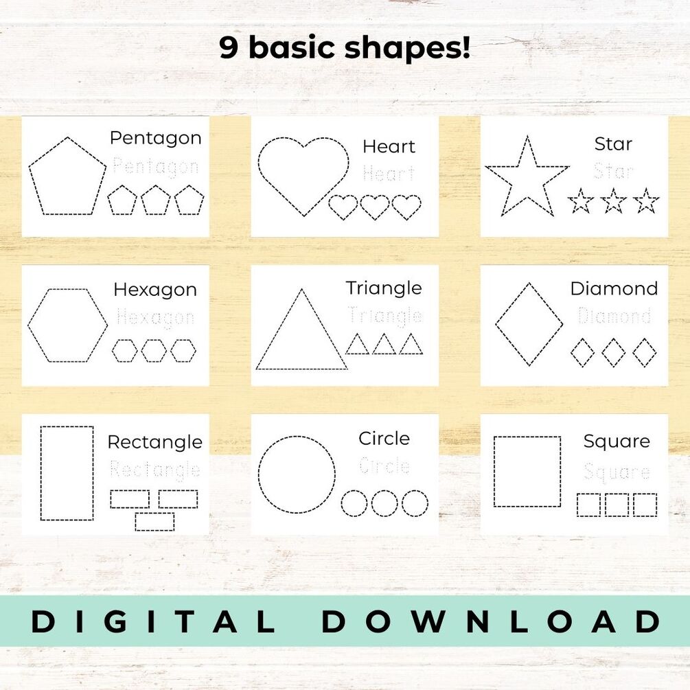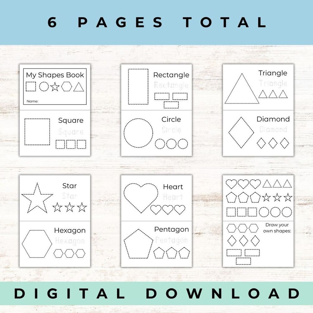 This six-page printable booklet includes 9 basic shapes for kids to trace, color, and recognize: heart, pentagon, hexagon, triangle, square, star, circle, diamond, and rectangle.