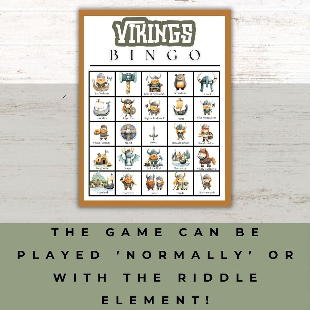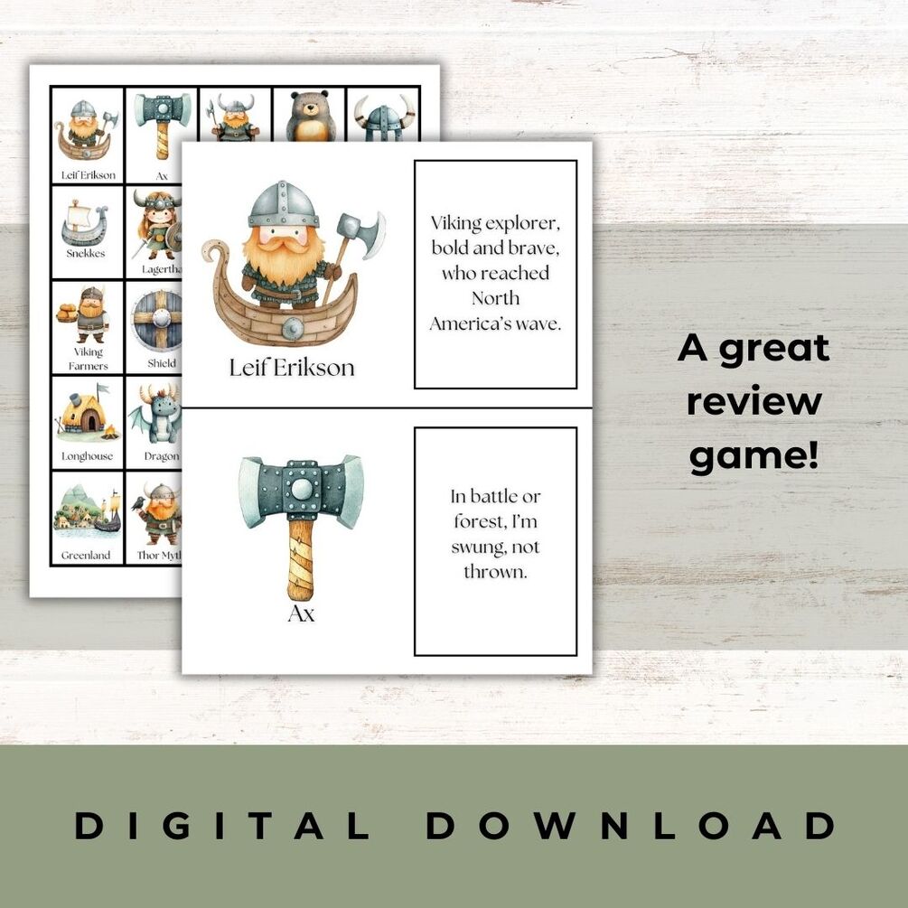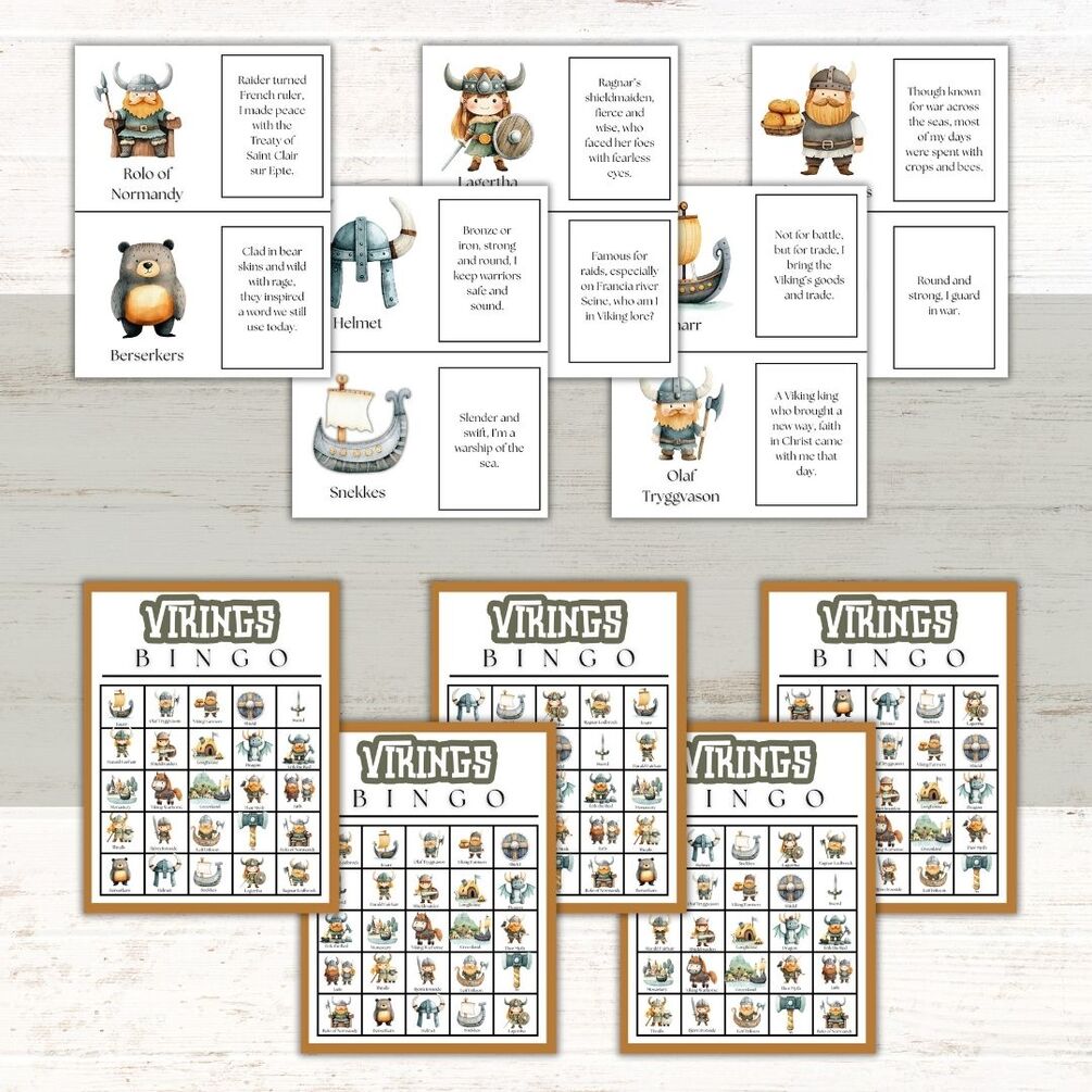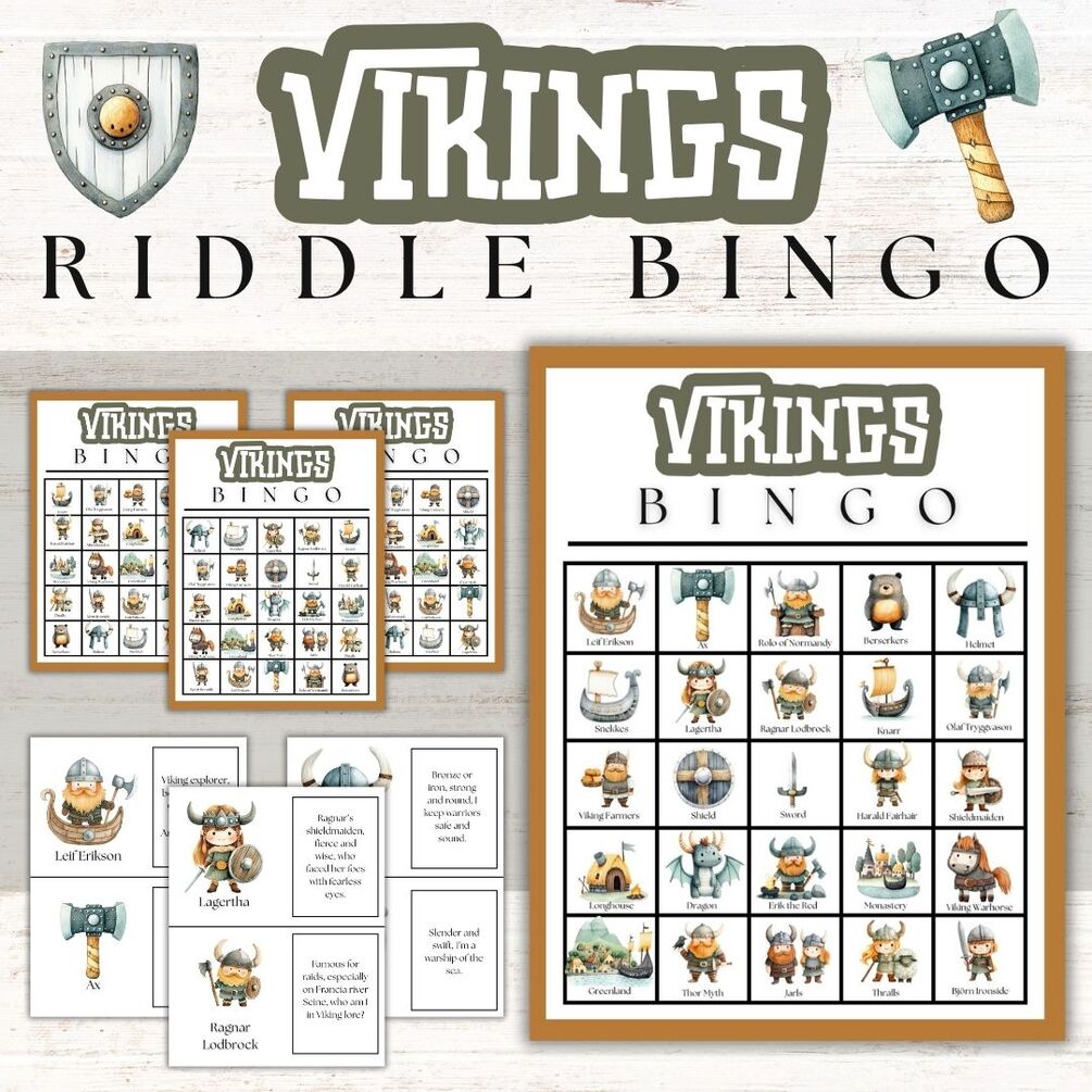 Set sail on a Viking adventure with this Viking Riddle Bingo game, featuring charming hand-painted watercolor illustrations! This isn’t just your ordinary bingo – each calling card comes with a clever Viking-themed riddle to solve before you mark your board. It’s the perfect blend of fun and learning for classrooms, history lessons, homeschool activities, family game nights, or Viking-themed parties.