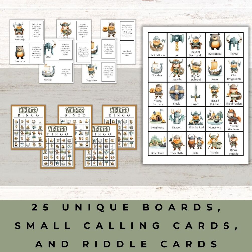 🎯 25 Unique Bingo Boards – each with beautiful watercolor Viking characters, ships, and symbols.