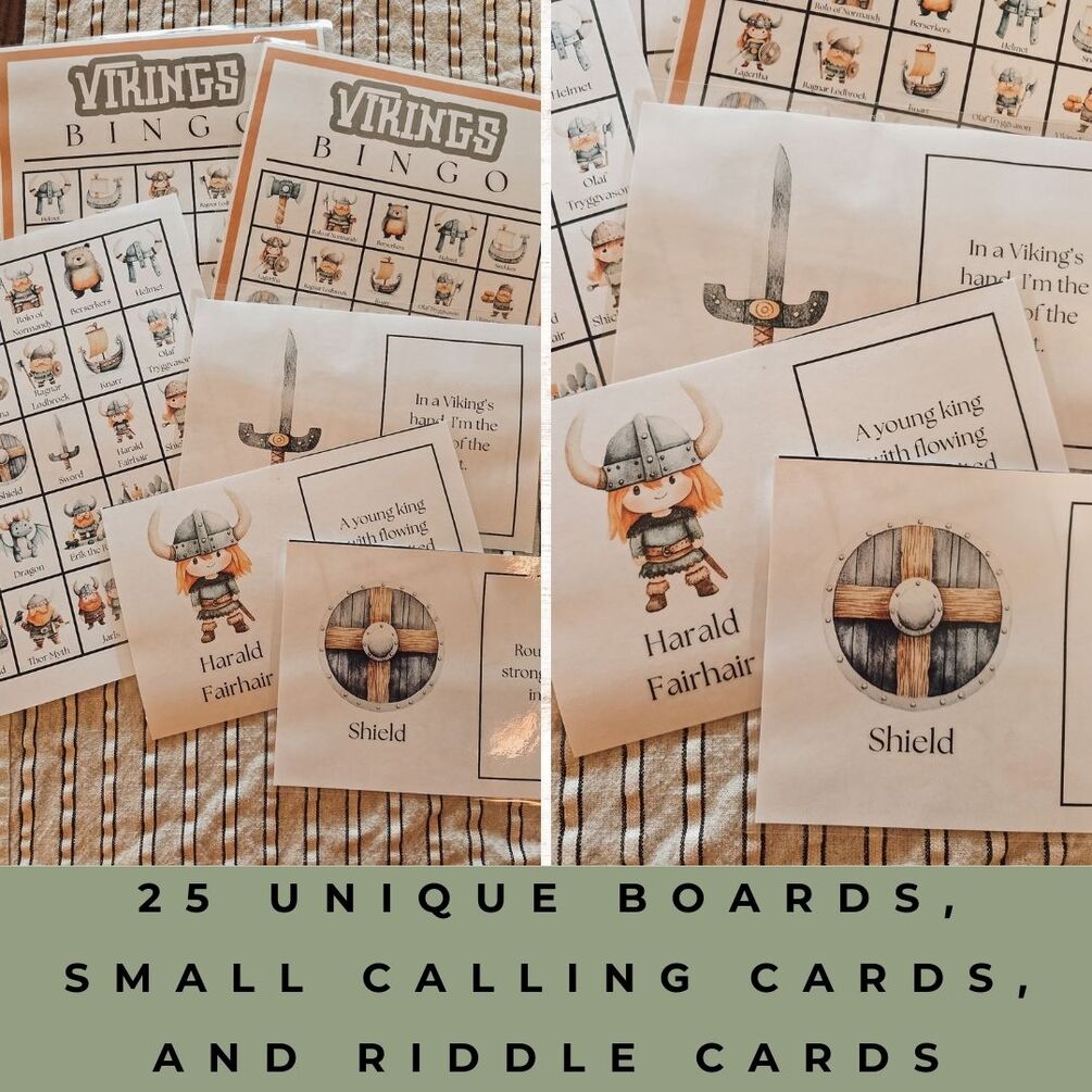 Set sail on a Viking adventure with this Viking Riddle Bingo game, featuring charming hand-painted watercolor illustrations! This isn’t just your ordinary bingo – each calling card comes with a clever Viking-themed riddle to solve before you mark your board. It’s the perfect blend of fun and learning for classrooms, history lessons, homeschool activities, family game nights, or Viking-themed parties.